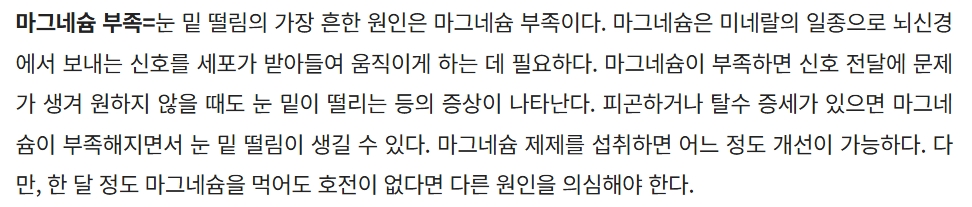 평소에 밥을 잘 안 챙겨 드시거나 식사를 거르시면 이 영양소가 훅 떨어지기 쉽습니다. 저도 예전에 바빠서 대충 챙겨 먹었더니 바로 눈가가 파르르 떨리더라고요. 견과류나 바나나를 틈틈이 드셔주시면 금방 가라앉을 겁니다.