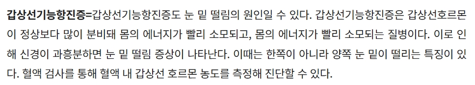 갑상선 호르몬이 너무 많이 나오면 우리 몸의 신경계가 과도하게 예민해져서 양쪽 눈이 다 떨리는 현상이 생길 수 있습니다. 체중이 갑자기 빠지거나 극심한 피로감이 동반된다면 피검사를 통해 꼭 체크해 보시길 권해드립니다.
