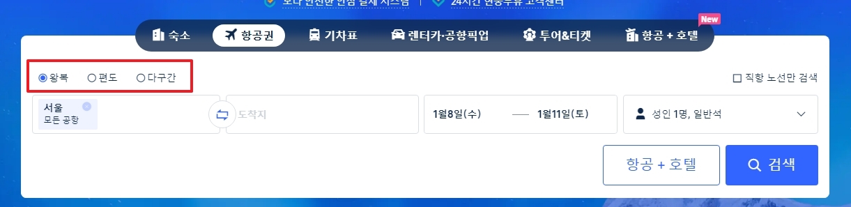 출발지와 도착지를 정확하게 입력하신 뒤, 달력을 열어 왕복 날짜를 지정해 주시면 됩니다. 원활한 검색을 위해 아래 항목들을 미리 정해두시면 훨씬 편하게 둘러보실 수 있어요.