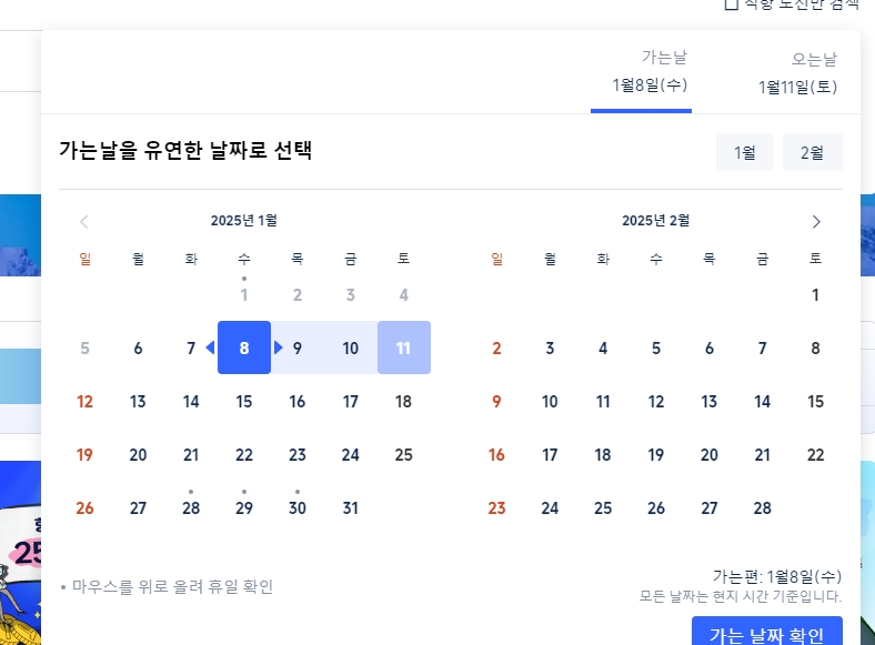 가장 먼저 일정에 맞는 목적지와 날짜를 정해서 검색을 시작해 봅니다. 2박3일 해외여행 추천 일정을 짤 때는 주말을 끼고 가는지, 평일에 가는지에 따라 항공권 금액 차이가 꽤 나는 편입니다.